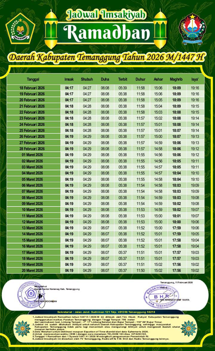 Jadwal Imsakiyah Ramadhan Daerah Kabupaten Temanggung Tahun 2026 M/1447 H